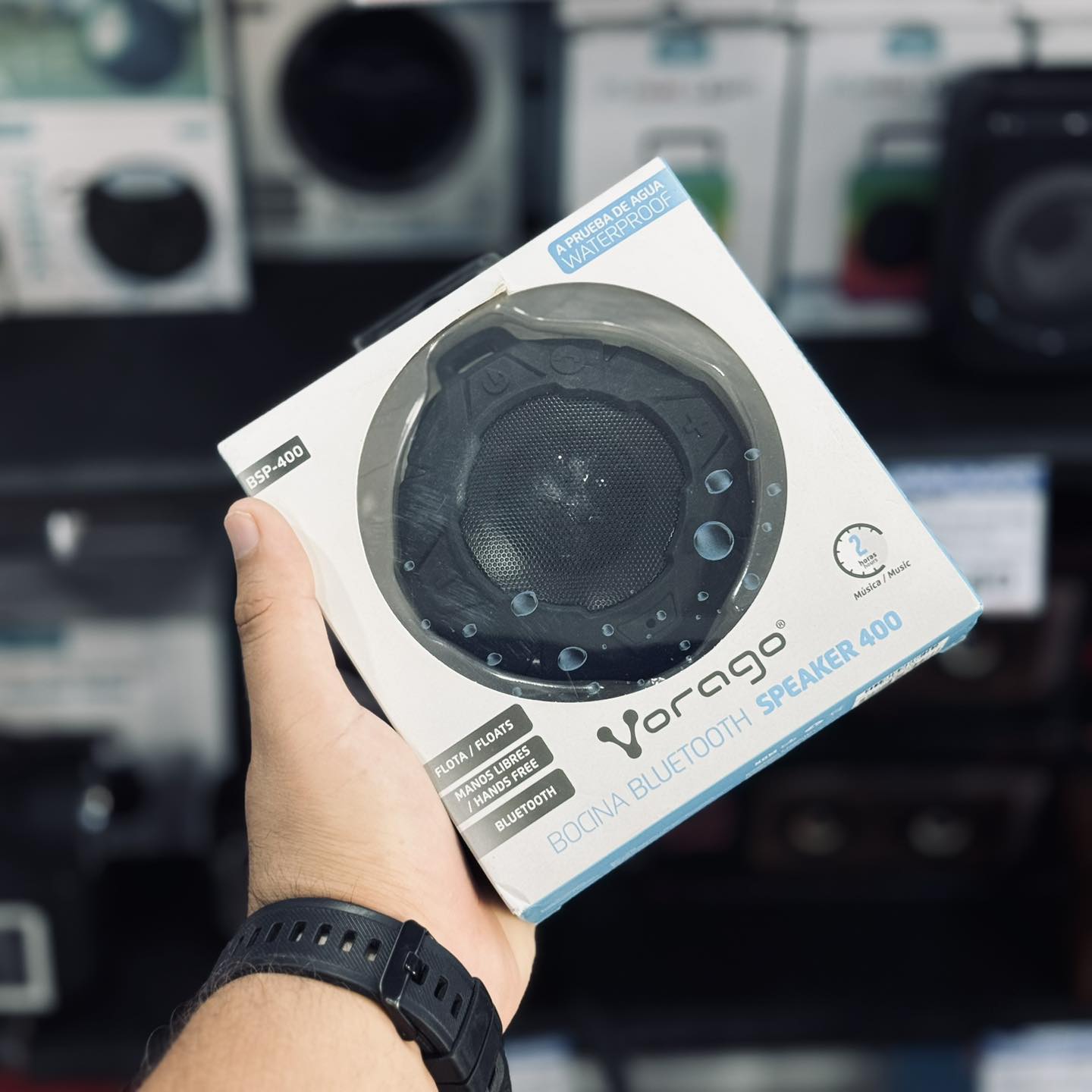 Escucha música con la bocina VORAGO, tiene una excelente calidad en la cual es aprueba de agua. Además cuenta con una larga duración de batería y con la calidad de sonido.