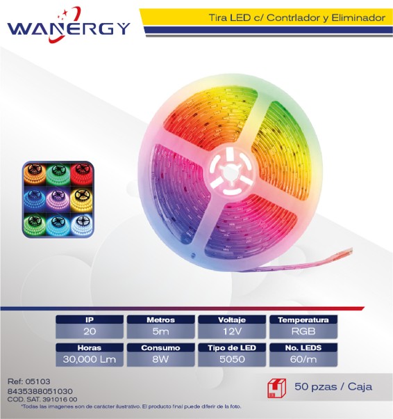 TIRA LED 5 METROS RGB 5050 12V 60 LEDS CON ELIMINIDAOR