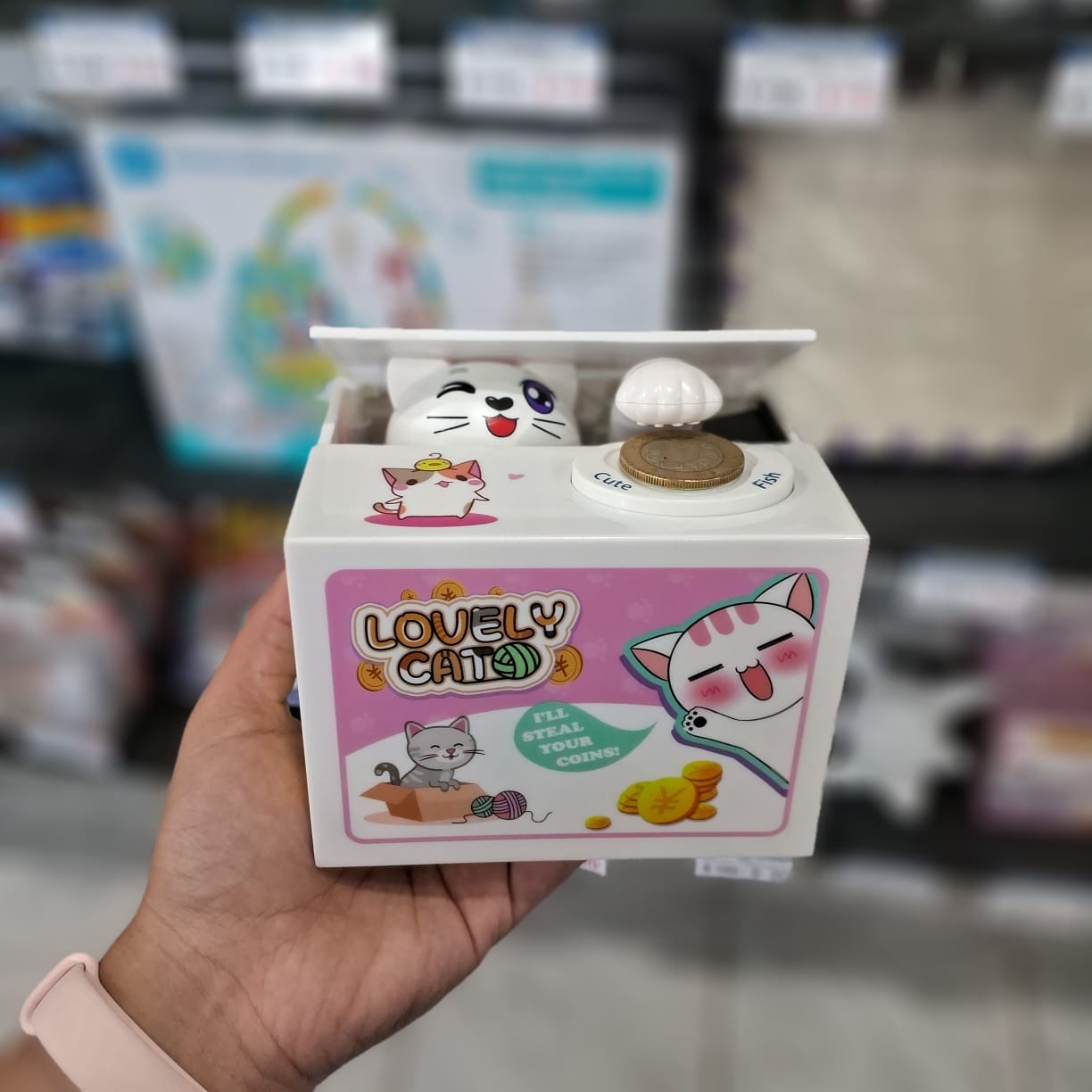Esta alcancia no solo ayudará al ahorro de tus monedas, si no también cuenta con un diseño coqueto y con movimiento muy lindo al tomas la moneda